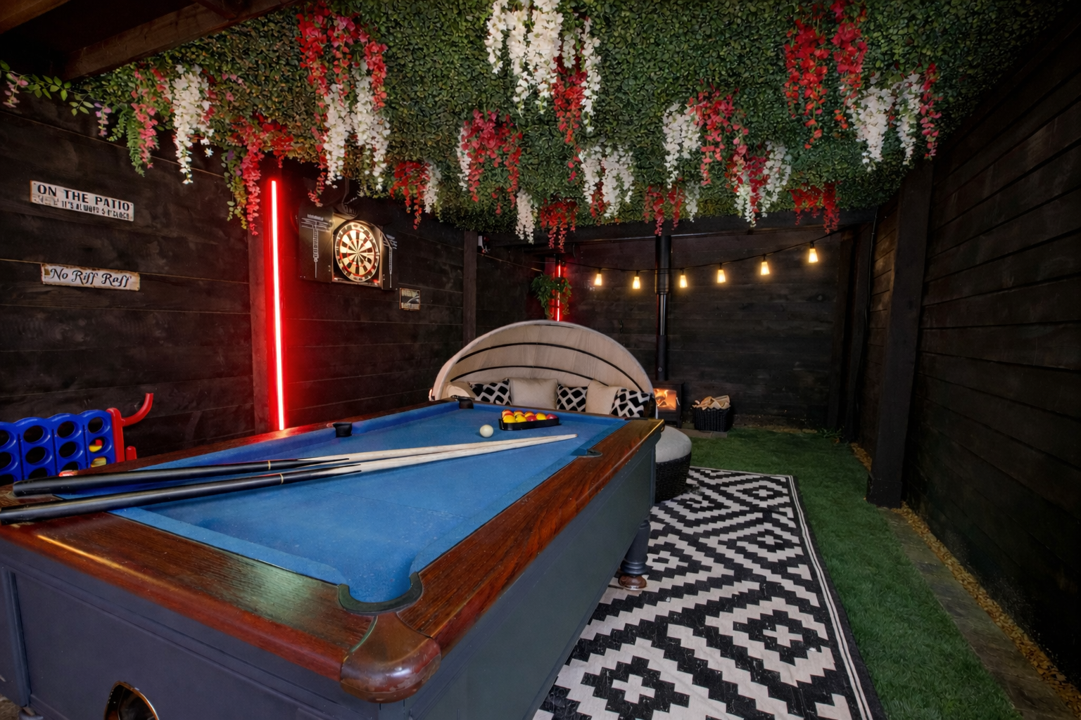 For entertainment, Holly Tree Lodge offers something a little different. Challenge each other to a game on the pool table, or enjoy a cosy movie night with the projector screen. A stylish indoor day bed provides the perfect spot to relax with a drink or a good book.