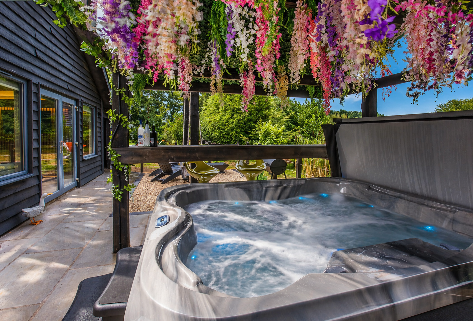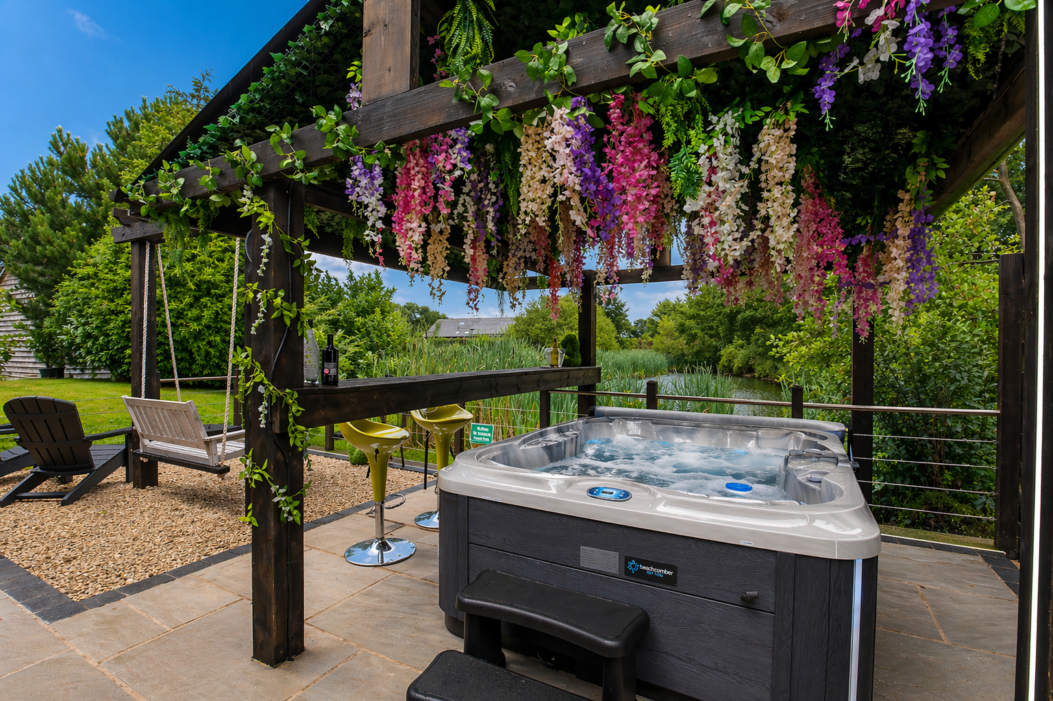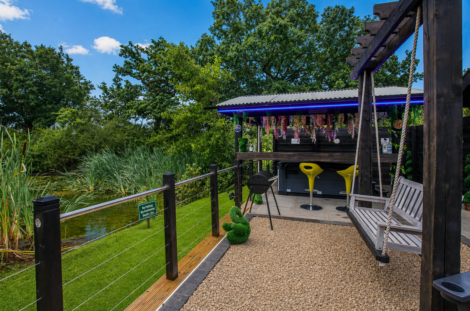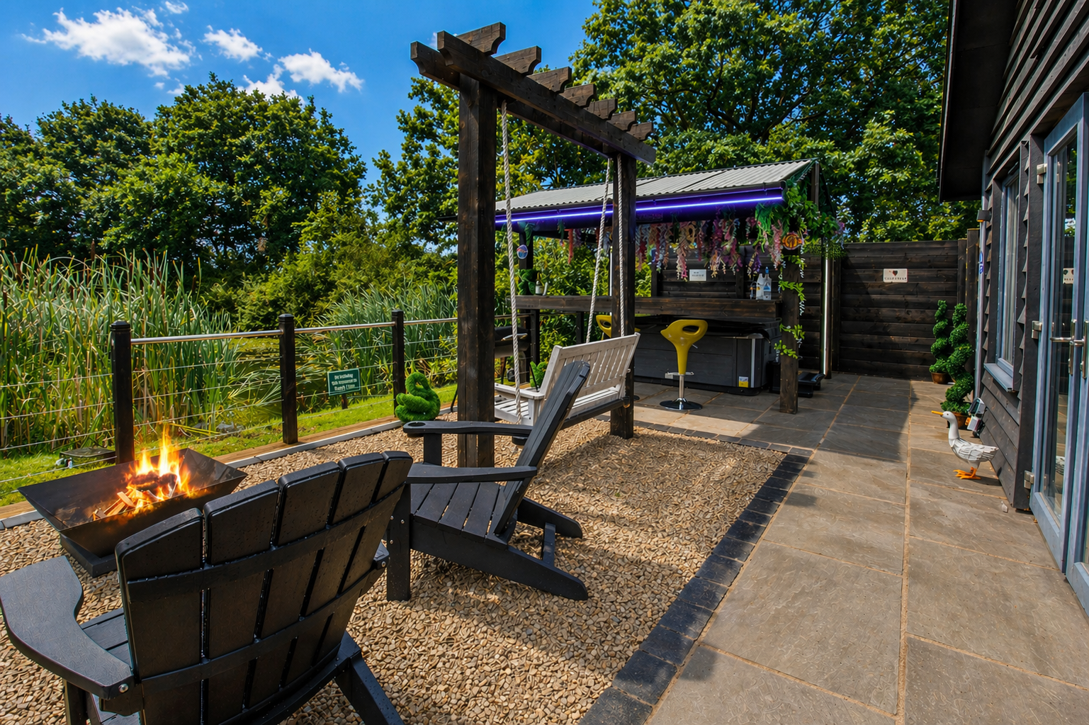 The stunning outside area offers a outside swing over lookingthe peaceful lake setting , a patio area with a fire fit, overlooking the lake. With a small outdoor bistro dining set for 2, a comfortable L shaped rattan sofa and a luxury 4 seater hot tub with a built in bar space and stools.