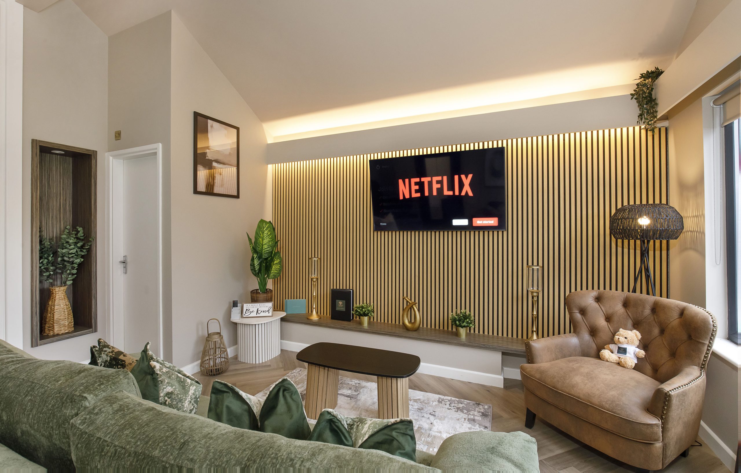 The outside snug area provides a large projector screen where you can hook your phone up and watch all of your favourite shows in the comfort of a large sofa and log burner for the colder evenings…