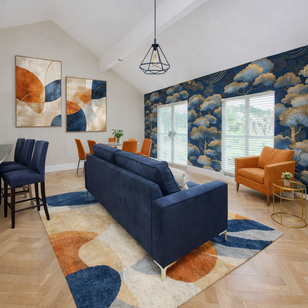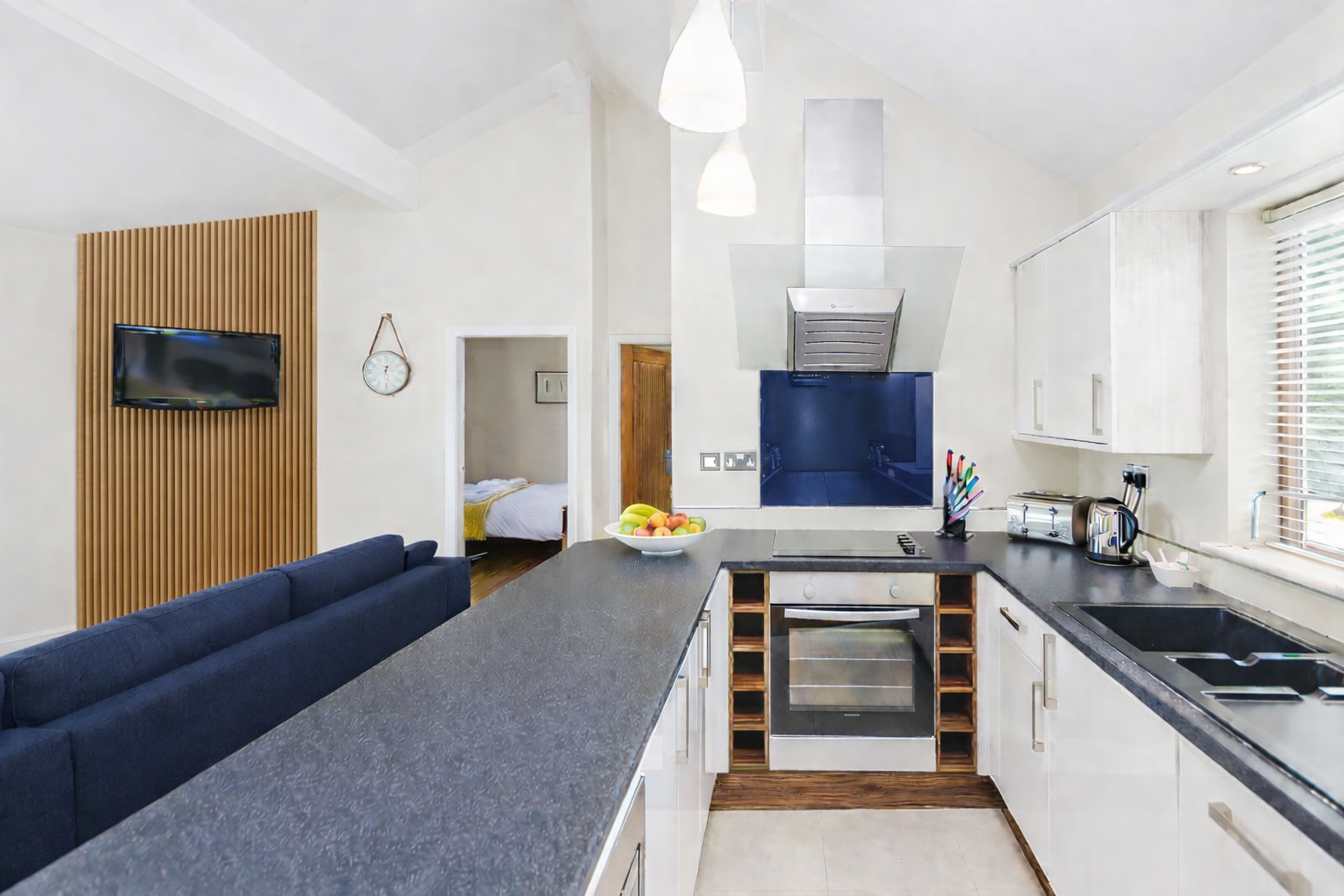 The inviting living space offers a comfortable sofa and armchair, perfectly positioned to enjoy the Smart TV, making it ideal for cosy nights in.