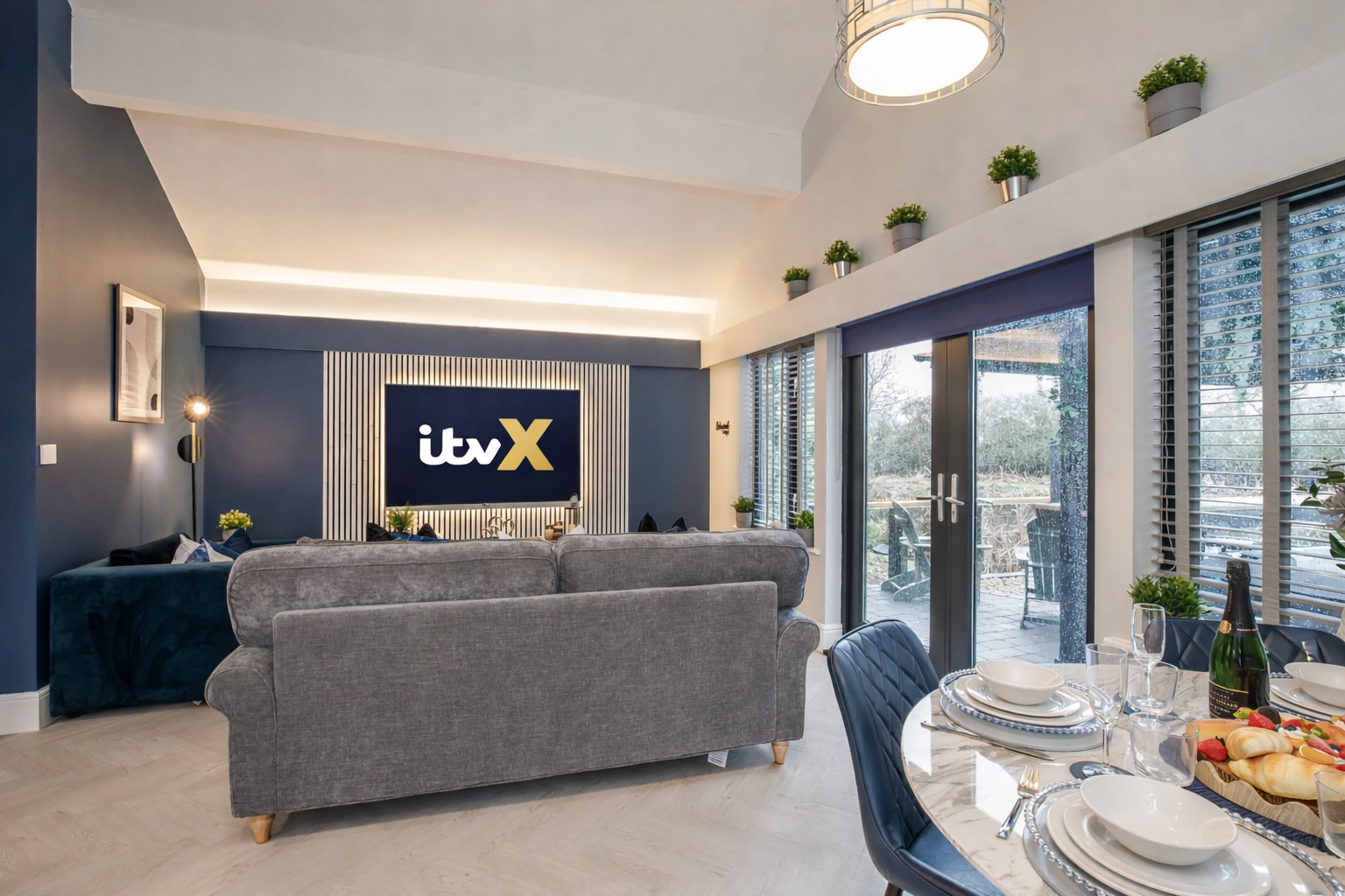 The living space provides a comfortable sofa overlooking the Smart 55 inch Tv.